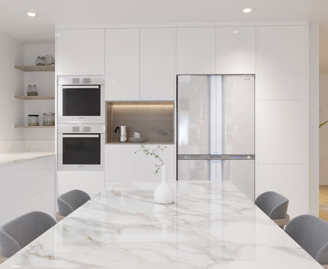Projeto 3D de um open space que integra sala e cozinha num apartamento em Basileia. O desafio foi otimizar ao máximo a área disponível, criando uma divisão subtil mas eficaz entre as zonas, garantindo funcionalidade e conforto em cada ambiente. A proposta combina soluções inteligentes de layout, mobiliário e acabamentos para um espaço fluido, prático e acolhedor.